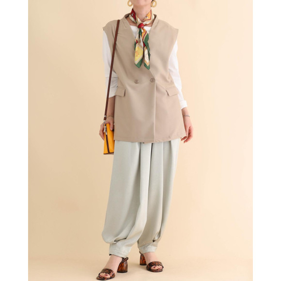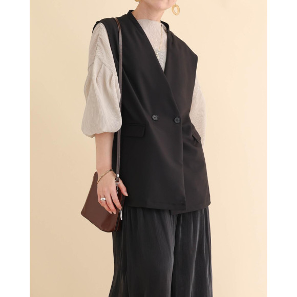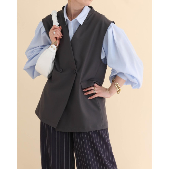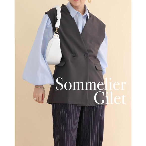 パリ3区のカフェテラス。夕暮れ時のアペロが似合う、ソムリエジレ。クラシカルなダブルボタンのデザインを、落ち感のあるやわらかな素材を使用することで、日常着しやすい1枚に仕上げました。