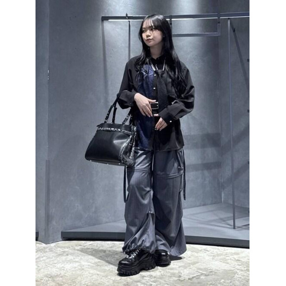 □フラップポケットにジップがポイントのミニポケットを組み合わせがモードな印象