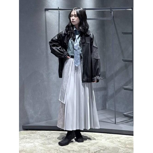 □ハレ定番のジャガード生地とポリエステル生地の異素材ドッキングが目を惹くプリーツスカート