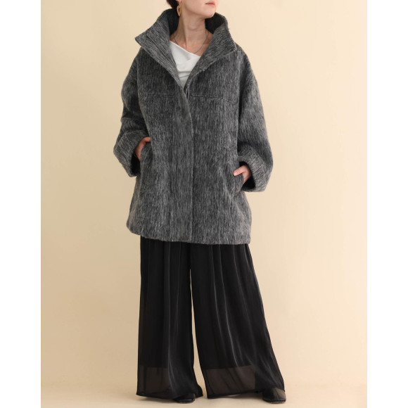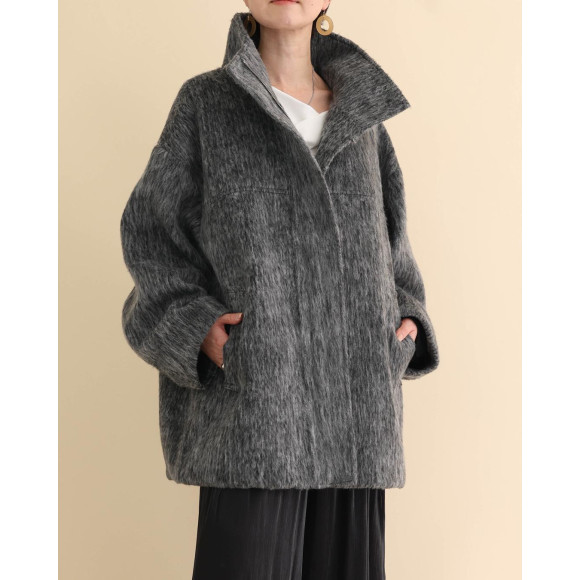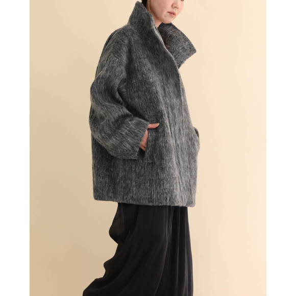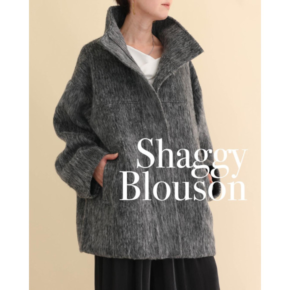 午後のまどろみのように優しい。レーヨン混のなめらかな肌触りのシャギー素材を使用したブルゾン。モノトーンでありながら、立体的な表情が存在感を放つ1枚です。オーバーサイズ感とスタンドカラーが、マニッシュな空気を漂わせつつ、素材が持つ柔らかさで絶妙なバランスに仕上げました。