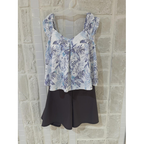 大人っぽい落ち着いたリーフプリントがポイントのワンピース風のセパレート水着。