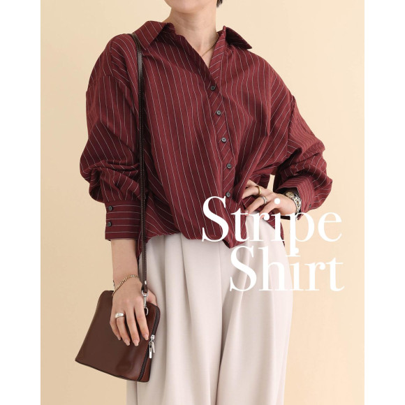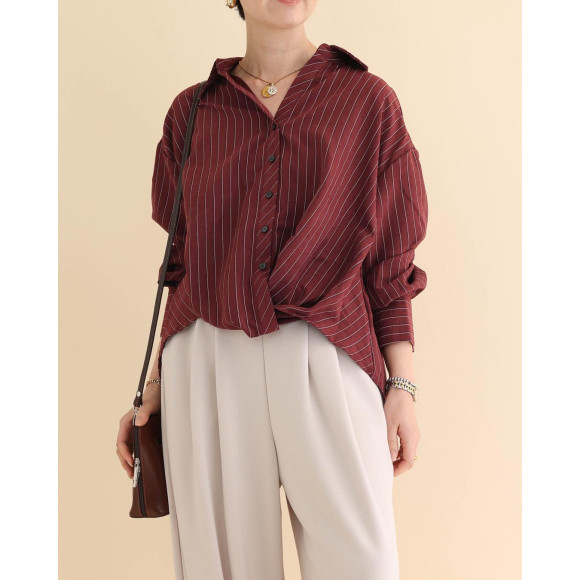 仕上げは、コンサバティブなシャツに、ボルドーの魔法でフェミニンな味付けを。ストライプの縦長ラインは、着痩せ効果も高めてくれます。春は白やベージュなどの淡色のボトムと組み合わせてご着用いただくと、軽やかな印象をお楽しみいただけます。