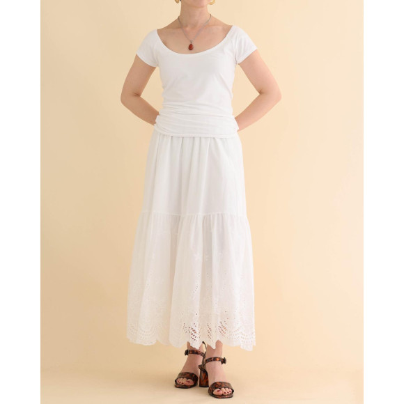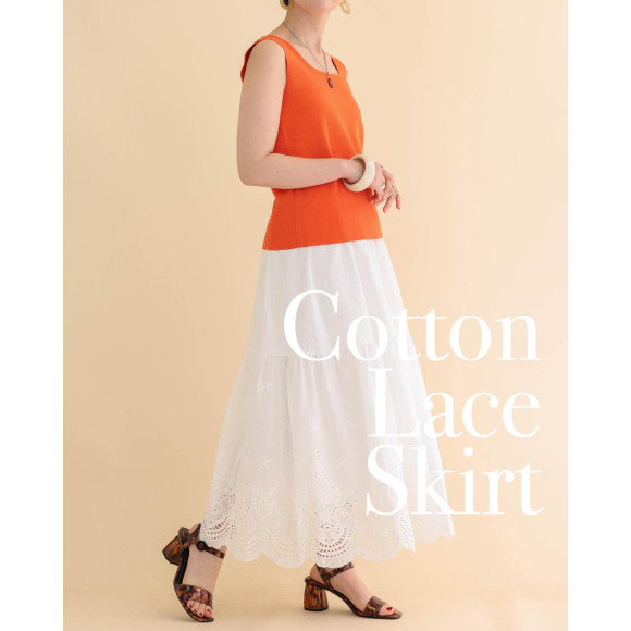 青空のコートダジュール。素敵なことが起こる、はじまりの予感。心地よい海風と、輝く水面が似合うコットンレースのスカートです。繊細な刺繍レースを施し、コットンが持つナチュラルな雰囲気に、上質なエッセンスをプラス。大人の乙女心を体現した1枚に仕上げました。