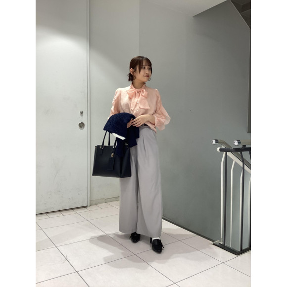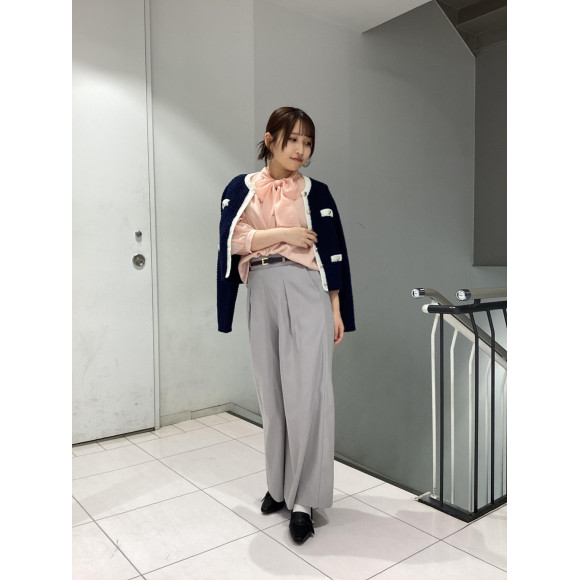 ネイビーのカーディガンとピンクのブラウスの合わせがとても可愛いく、職場でも春を感じていただけます!