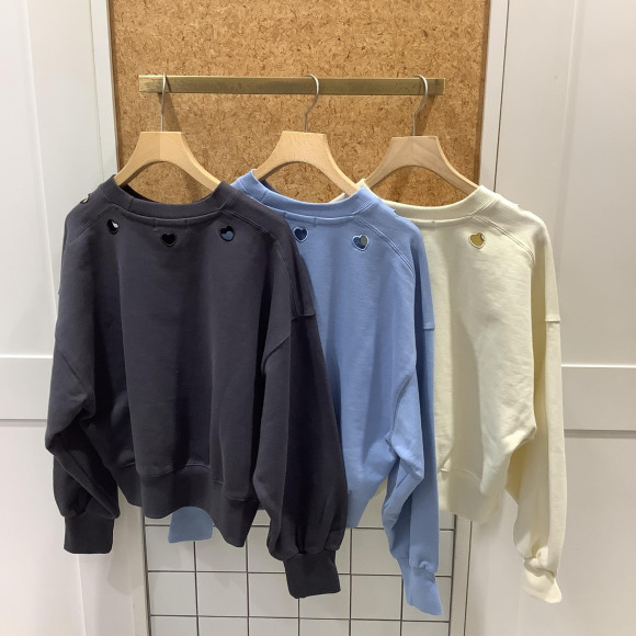 衿まわりにぐるりと小さなハートのカットワークを入れたスウェットトップス。