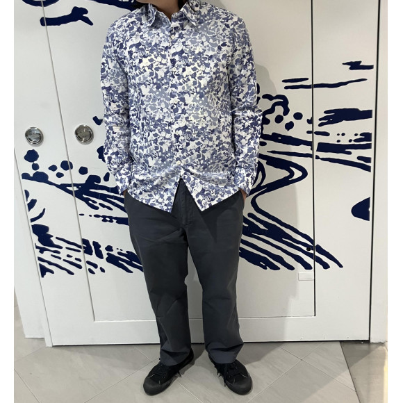 ブルーの花柄が春らしく爽やかな新作長袖シャツ。