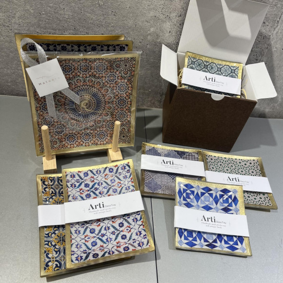 幾何学模様やタイル柄など様々なデザインのアンティーク調ガラストレイ多数ご用意しております!