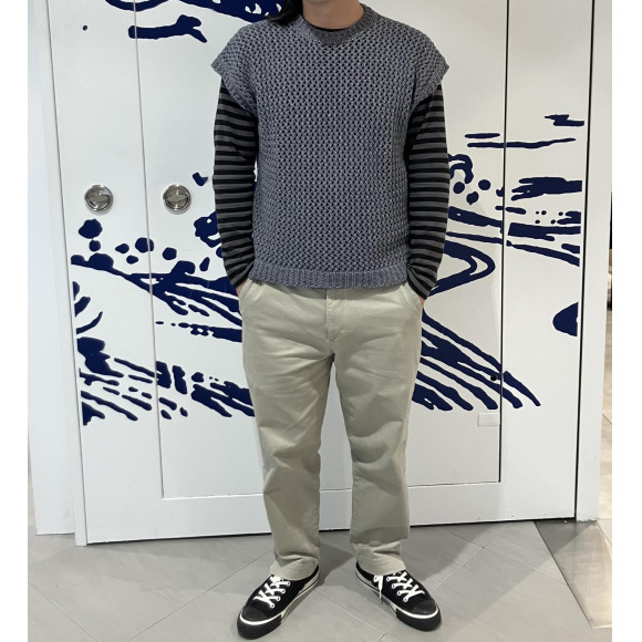 ざっくりとメッシュになるよう編まれたニット生地は透け感があり、シャツやTシャツとのレイヤードスタイルにオススメの一枚。