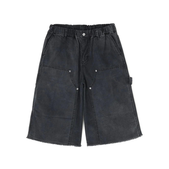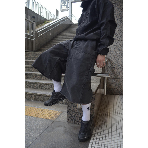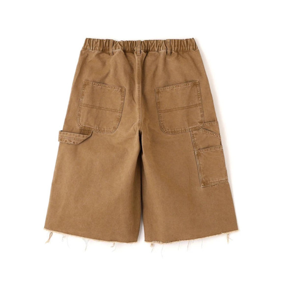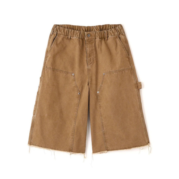 ダブルニーのペインターショーツをダック生地で作成。 あえて着古したような素材感でアタリや切りっぱなしのデザインを取り入れています。 ひざ下くらいの長めの丈のワイドな形になっており、今が気分のシルエットショーツです