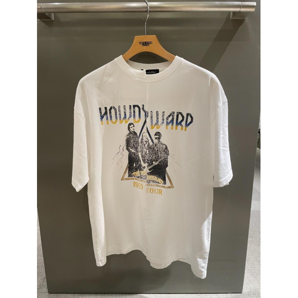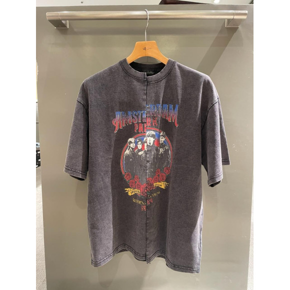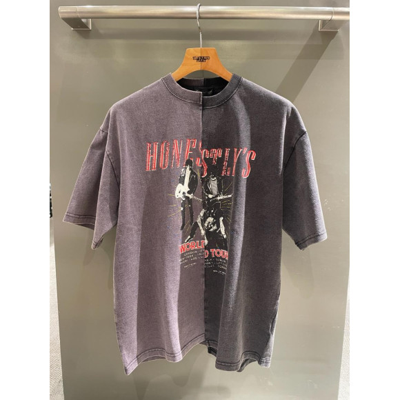 架空のロックバンドをイメージしたグラフィックを、あえて一度解体して左右で段違いに繋ぎ合わせることで、リメイク風の仕上がりが目を引くTシャツです。