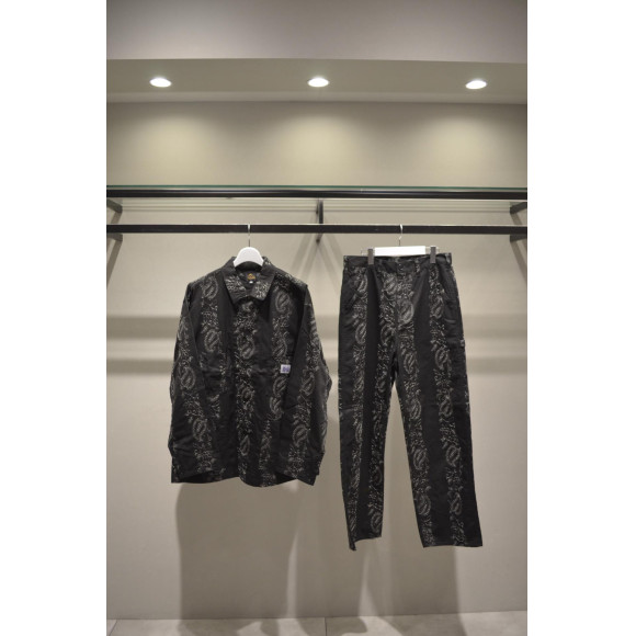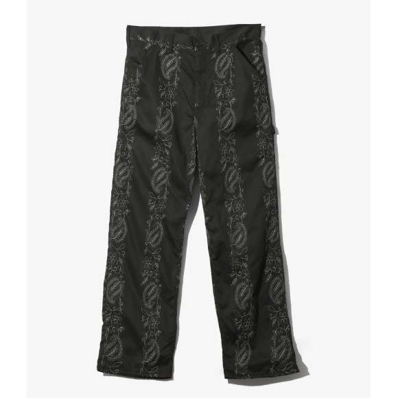 ツールポケットやハンマーループを備えた、ワイドストレートシルエットのオーセンティックなワークパンツ。少し光沢を感じる薄手のツイル素材にペイズリーの刺繍を施し、都会的な雰囲気に仕上がっています。