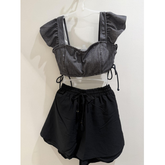 セットのショーツはアシンメトリーなデザインで、左サイドのツイストがポイント。