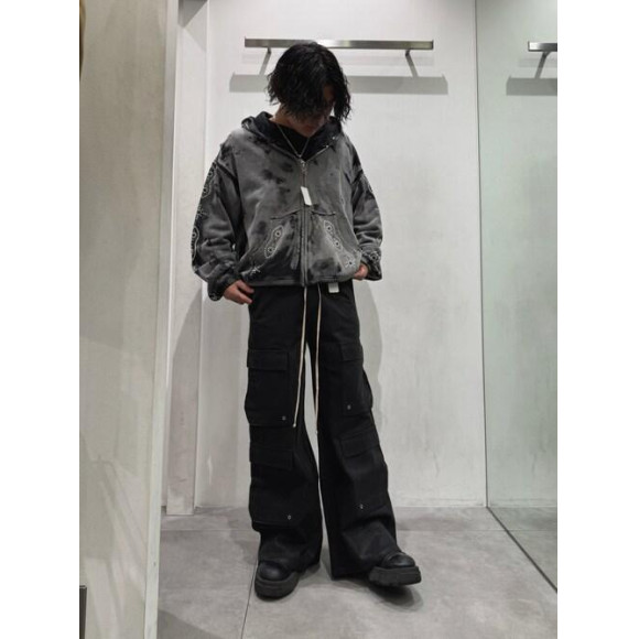 緩めのパーカーにカーゴパンツで緩すぎずに着れます。