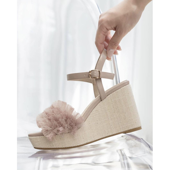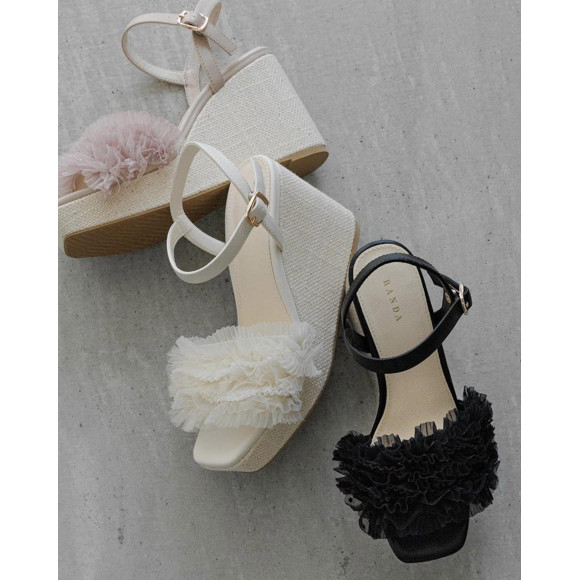 フェミニンムード漂うフリルデザインが目を惹くウェッジサンダル。