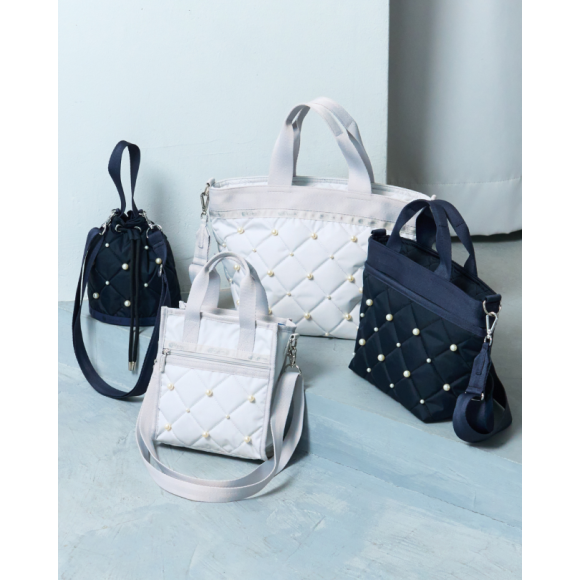 キルティング生地に大きさの異なるパールを散りばめた大人可愛い「パールコレクション」。デイリーに使える巾着ショルダー、スクエアミニトート、サイズ違いの舟形トートの4スタイルがラインナップ。アイスグレーとネイビーの2色展開です。