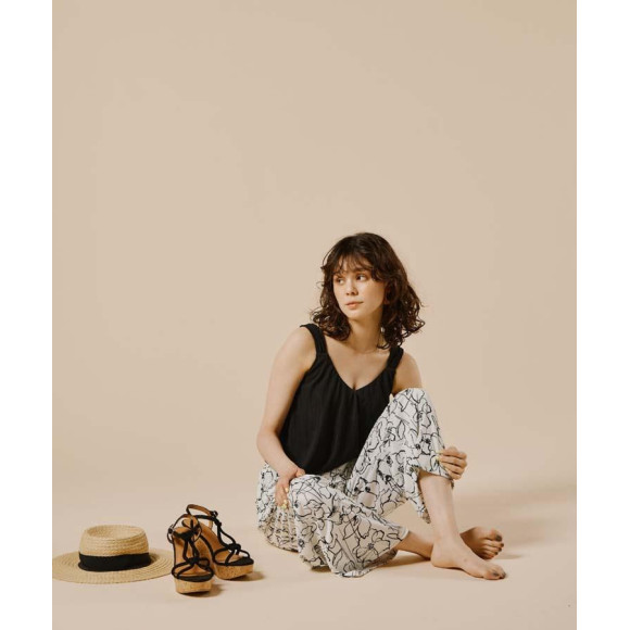 モダンなラインフラワー柄のロングパンツはウエストゴム仕様になっていて、リラックスして着用出来ます。