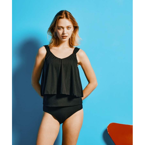 ゆったりシルエットのタンキニは繊細なリブ素材を使用。