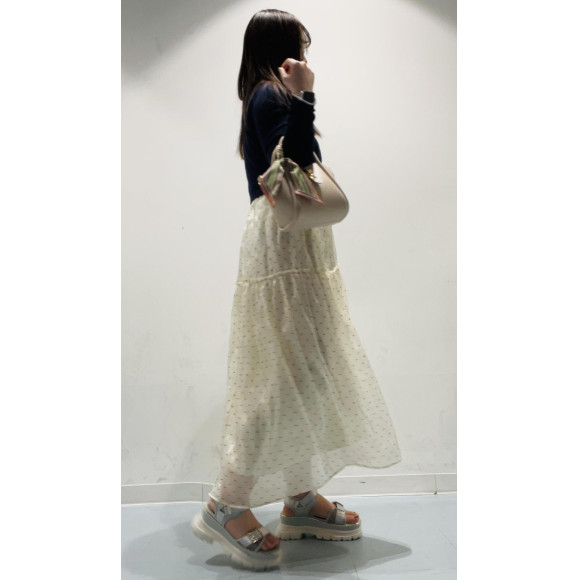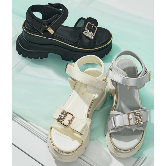キラキラと輝く煌びやかなバックルが足元を一段とお洒落に見せてくれる厚底サンダル。ベルト部分に光沢のあるサテン素材を使い、メタリックラインやバックル・パーツにゴールドを散りばめることで高級感溢れる1足になりました。シアー感のあるチュールとスポーツサンダルの重厚感のあるデザインのコントラストが、ワンランク上のスタイリングへと格上げしてくれます☆